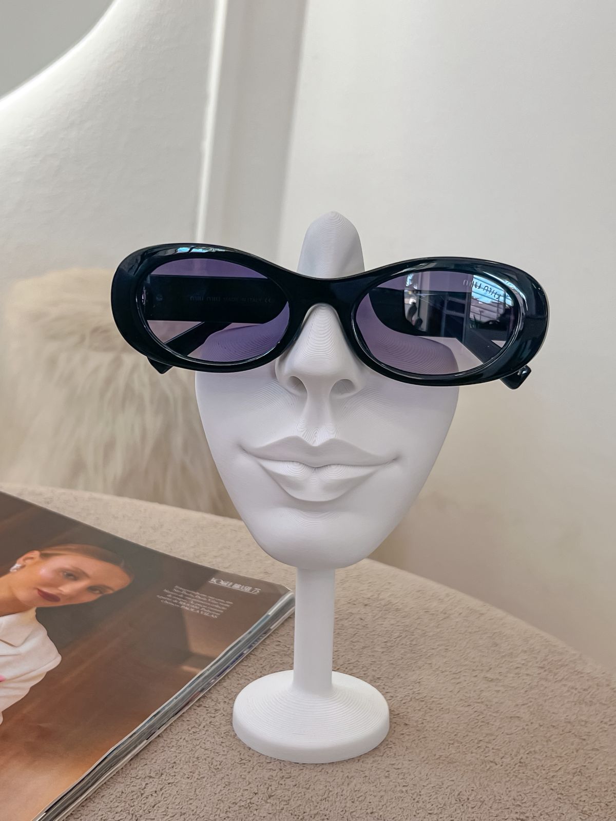Óculos de sol inspiração Miu Miu preto oval com lente escuta e detalhe na haste dourado;