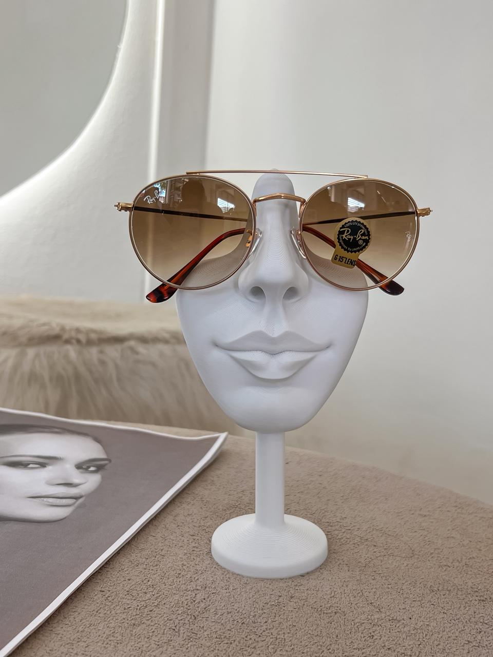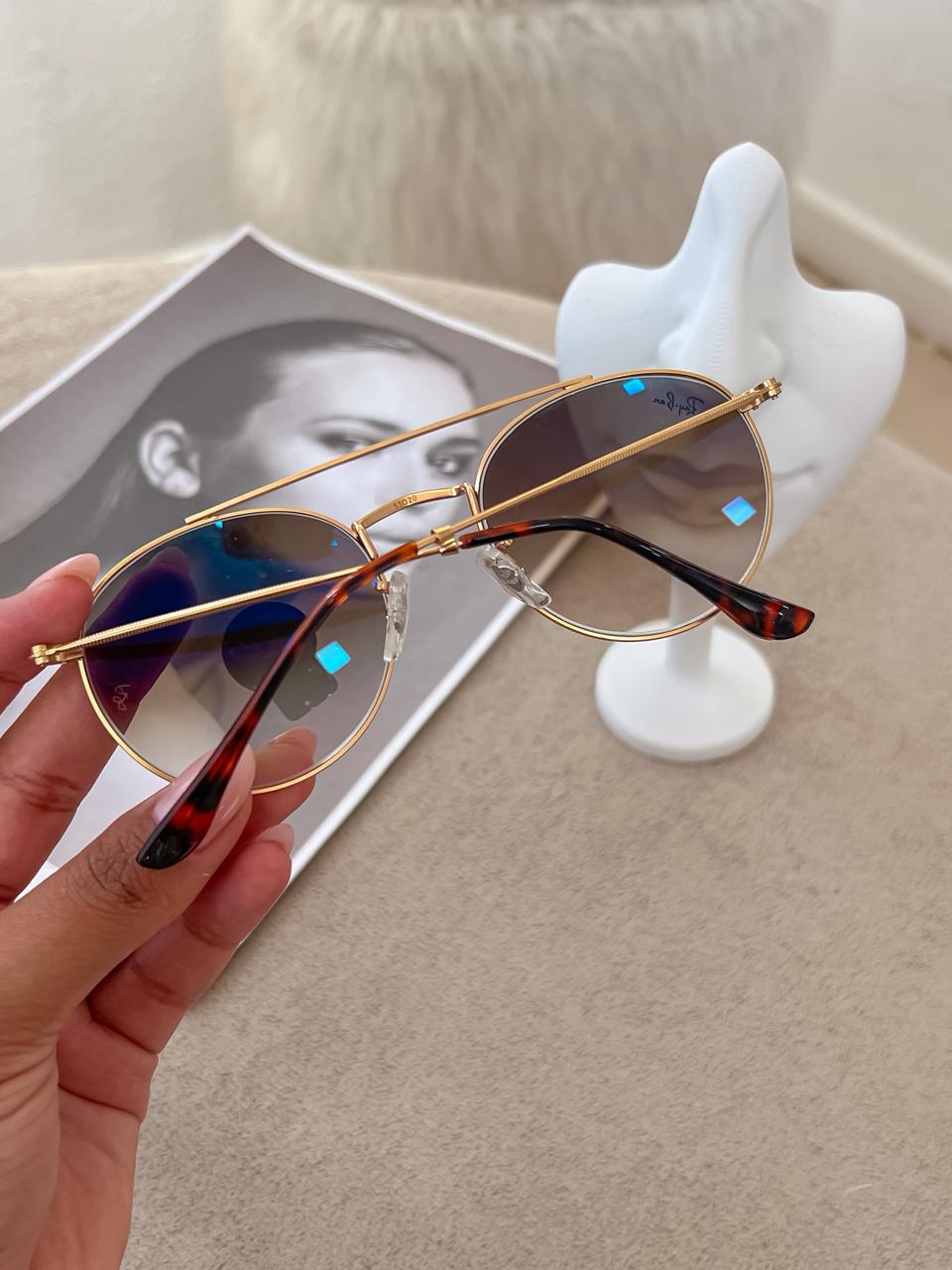Óculos de sol inspiração Ray-Ban redondo em metal dourado com lente marrom;