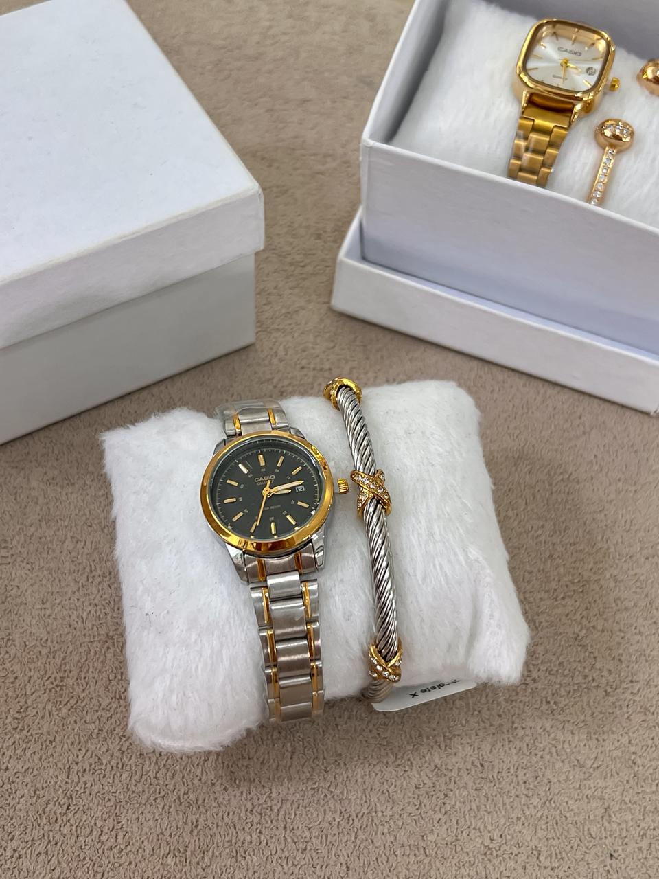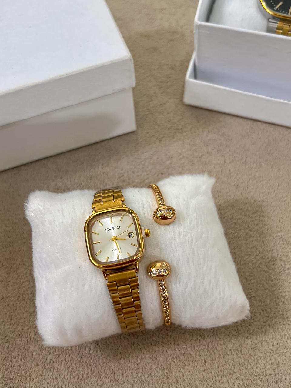 Relógio analógico casio mini quadrado dourado em aço inoxidável;
