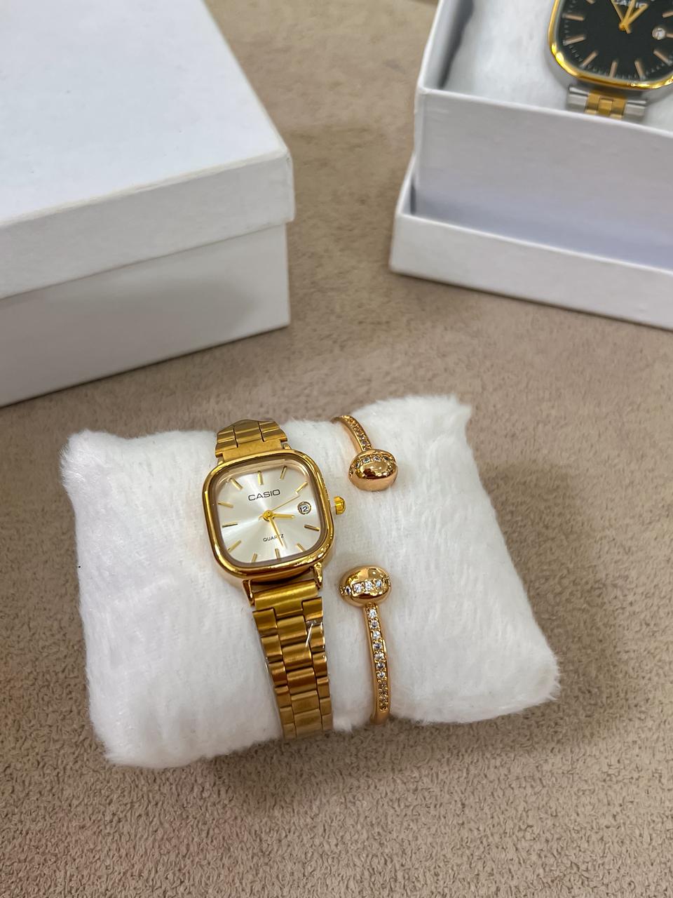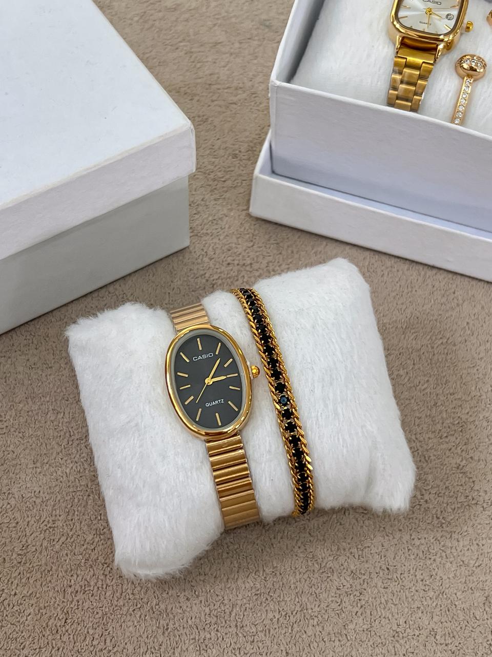 Relógio casio analógico oval dourado em aço inoxidável com pulseira ajustável;