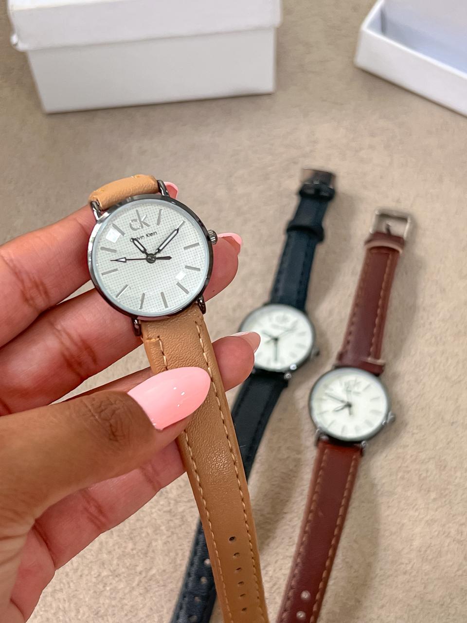 Relógio analógico inspiração Calvin Klein grafite com pulseira em couro ecológico preto;