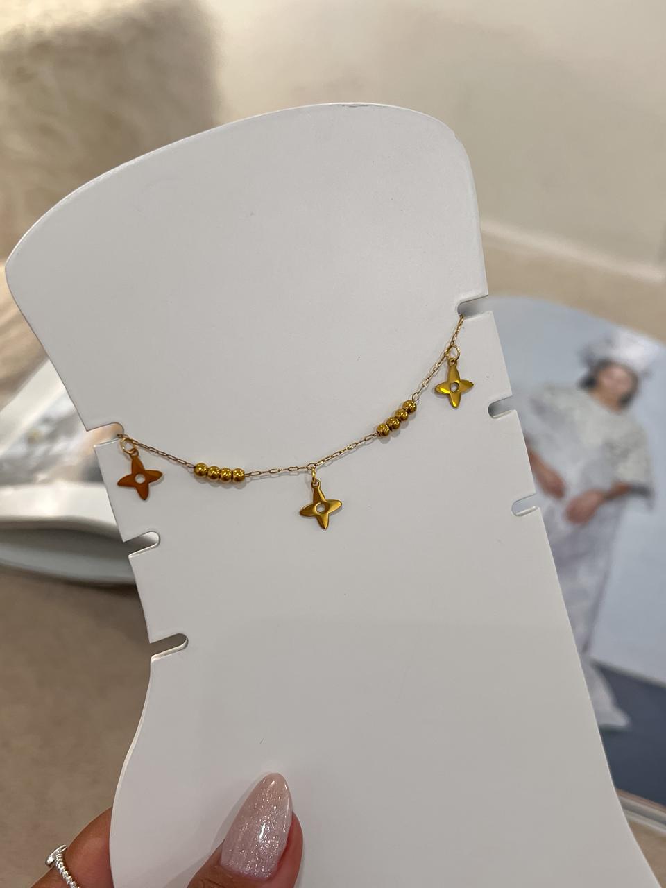 Tornozeleira com pingentes de esferas e estrelas em aço inoxidável no dourado.