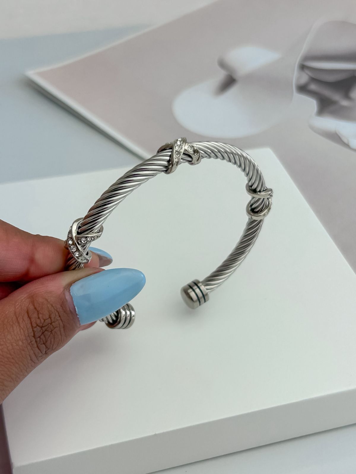Bracelete com detalhe em X com pedrinhas em aço inoxidável no prata.