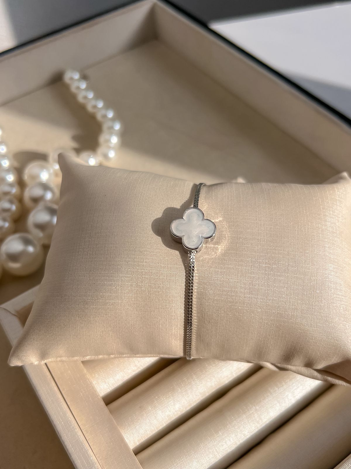 Pulseira Trevo prata com detalhe do trevo em branco perolado, semijóia;