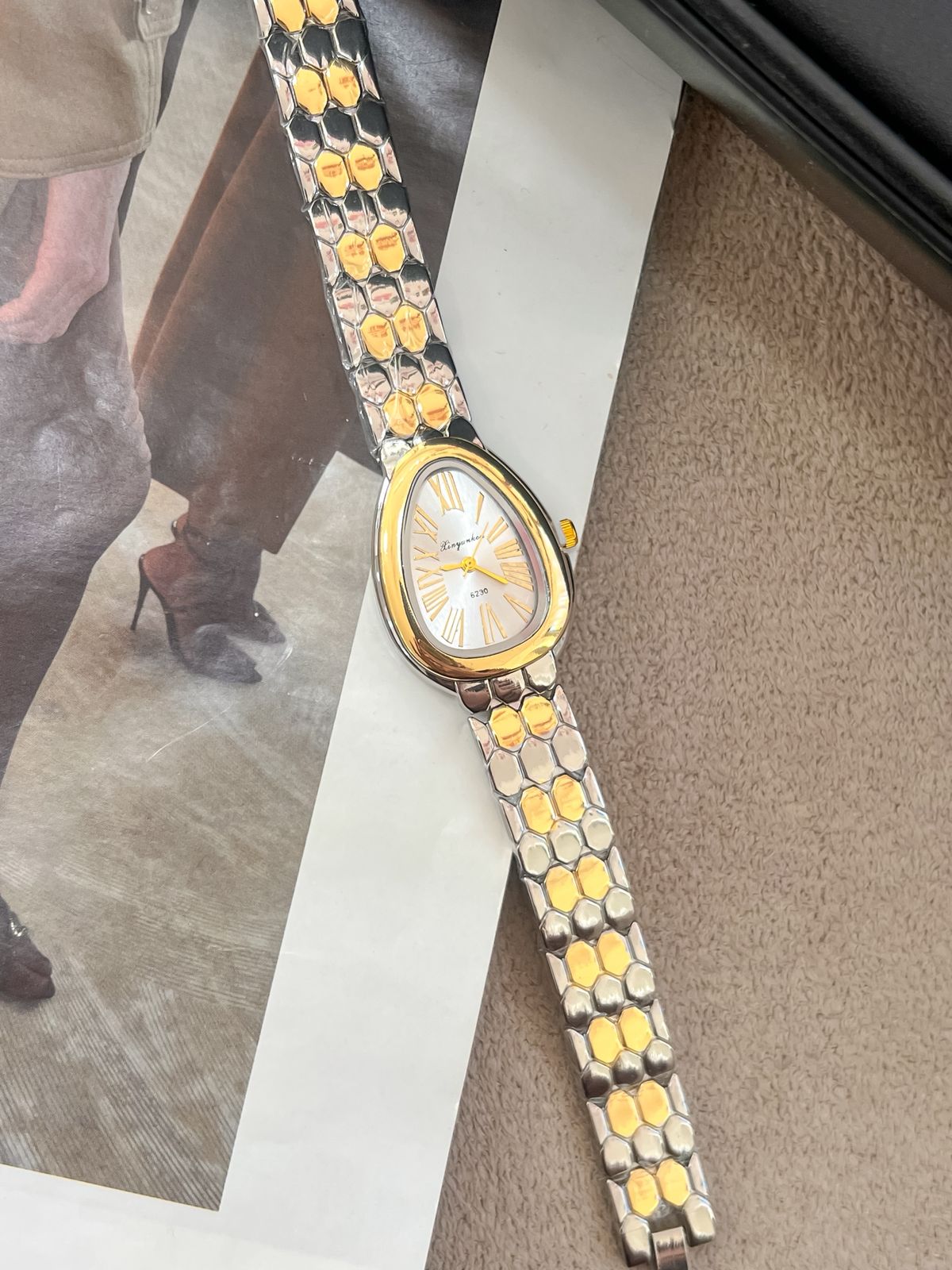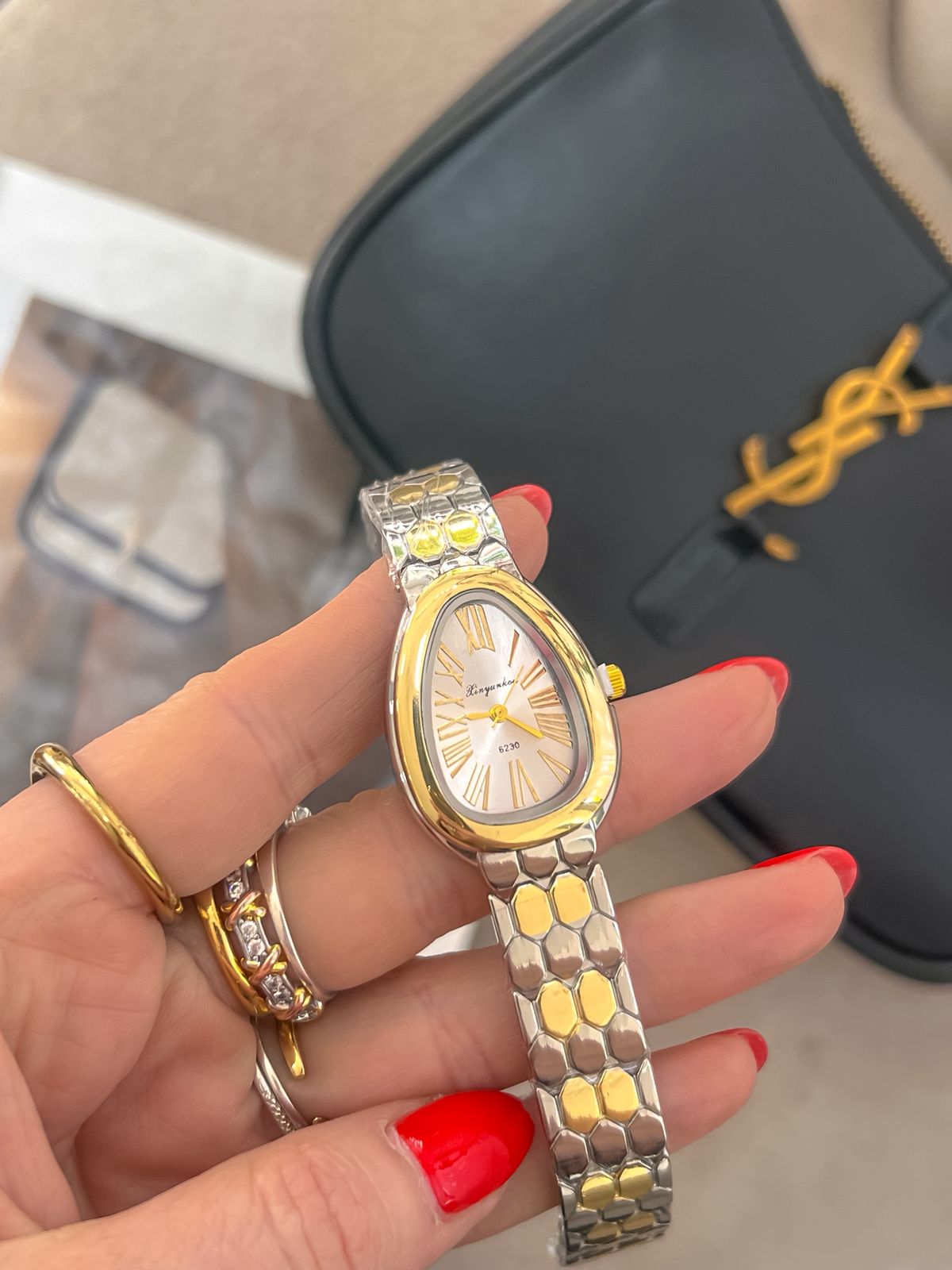 Relógio bicolor no formato oval inspiração Xinyunkou em aço inoxidável.