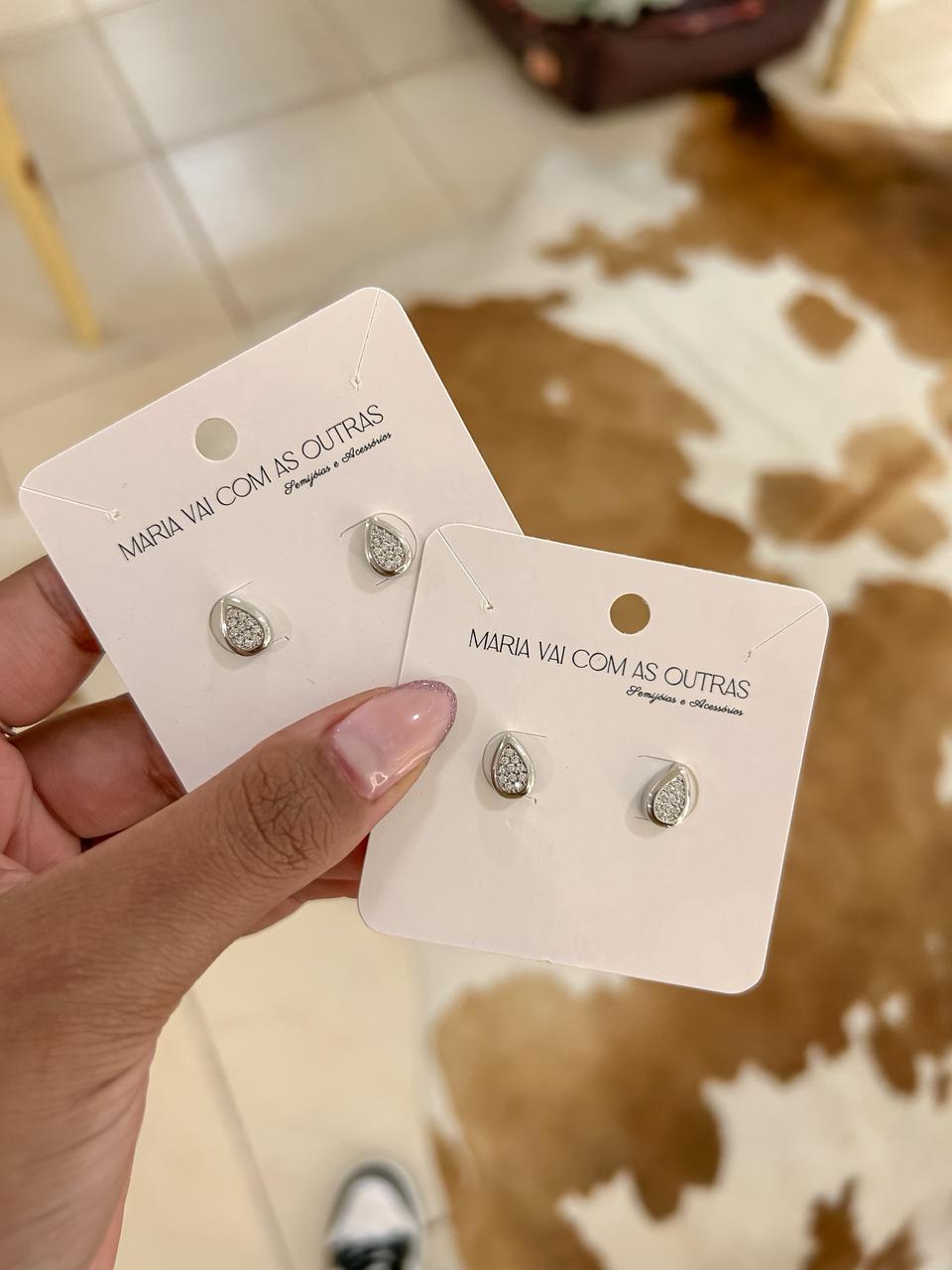 Brinco gota pequeno cravejado banhado em ouro branco;
