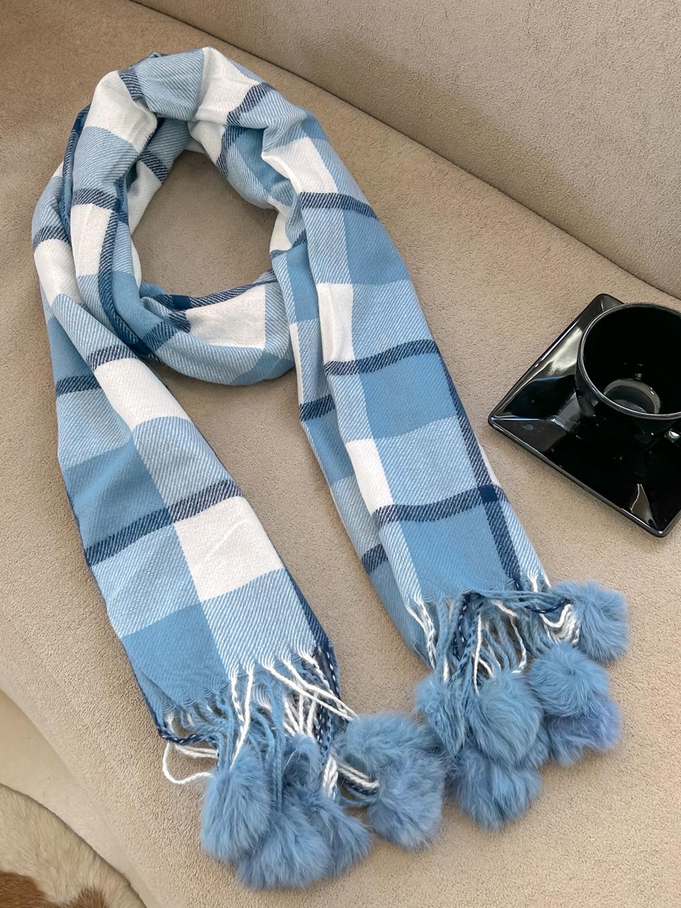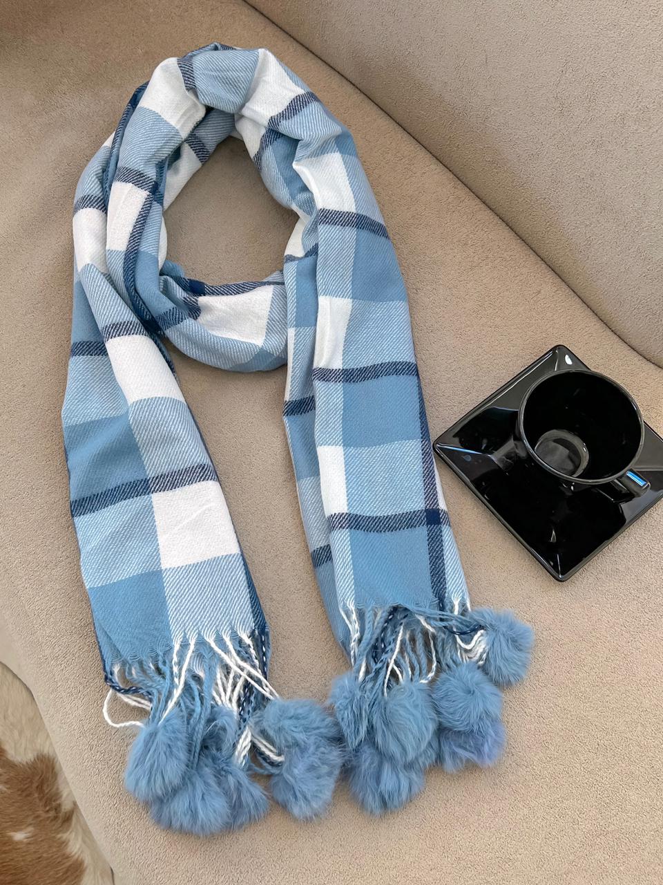 Manta pompom xadrez azul com branco.